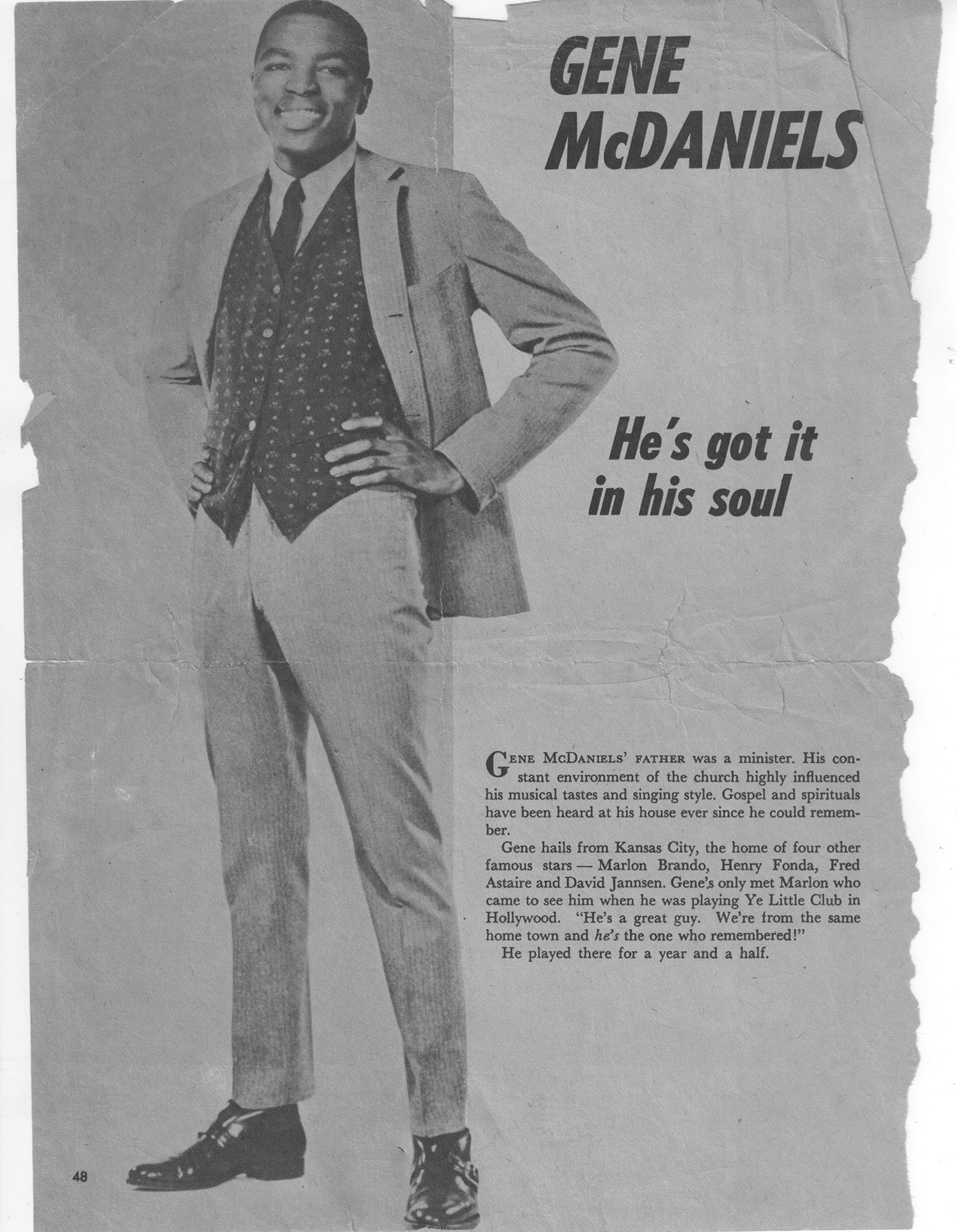 Sometime soon after The Admirals split up Gene moved to Los Angeles, when he was around 20 years old. Shortly after arriving he sat in with Les McCann; they ended up with a regular gig together at a place called The Lamp. Jazz was Gene’s first love, musically speaking. He felt deeply connected to the music of Miles Davis, John Coltrane, Cannonball Adderly, Wayne Shorter, Ornette Coleman and other jazz greats of this era and even had opportunity to open for Miles Davis at one point, though the details around that are a bit vague at this time. Despite Gene’s love for jazz, when the opportunity presented itself through Sy Waronker, founder of Liberty Records, to sign on with him in 1959 as a solo artist, Gene took it. Of Si, Gene said, "Sy was the nicest guy I ever met. Very emotional, music was his life. When I sang for him he cried.” Besides, earning a living as a singer was not easy then (or now), add to that the fact that Gene was black in America in the 1950’s and the challenge was multiplied by a huge factor.